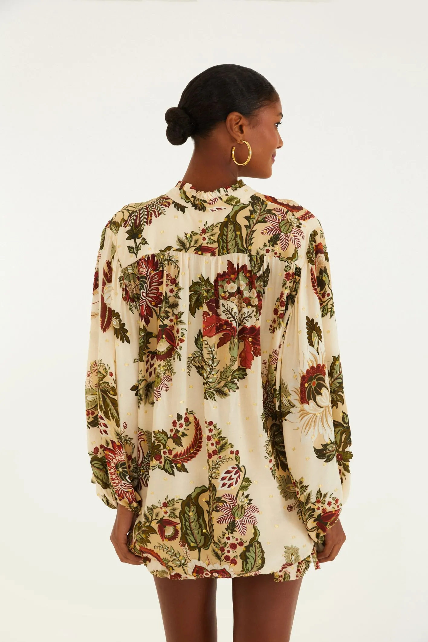Bata Estampada Floral Raiana com decote em v e detalhe de cordinha para amarração, ela inspira leveza e descontração. As mangas amplas trazem movimento e conforto, enquanto os babados na barra adicionam um toque especial.