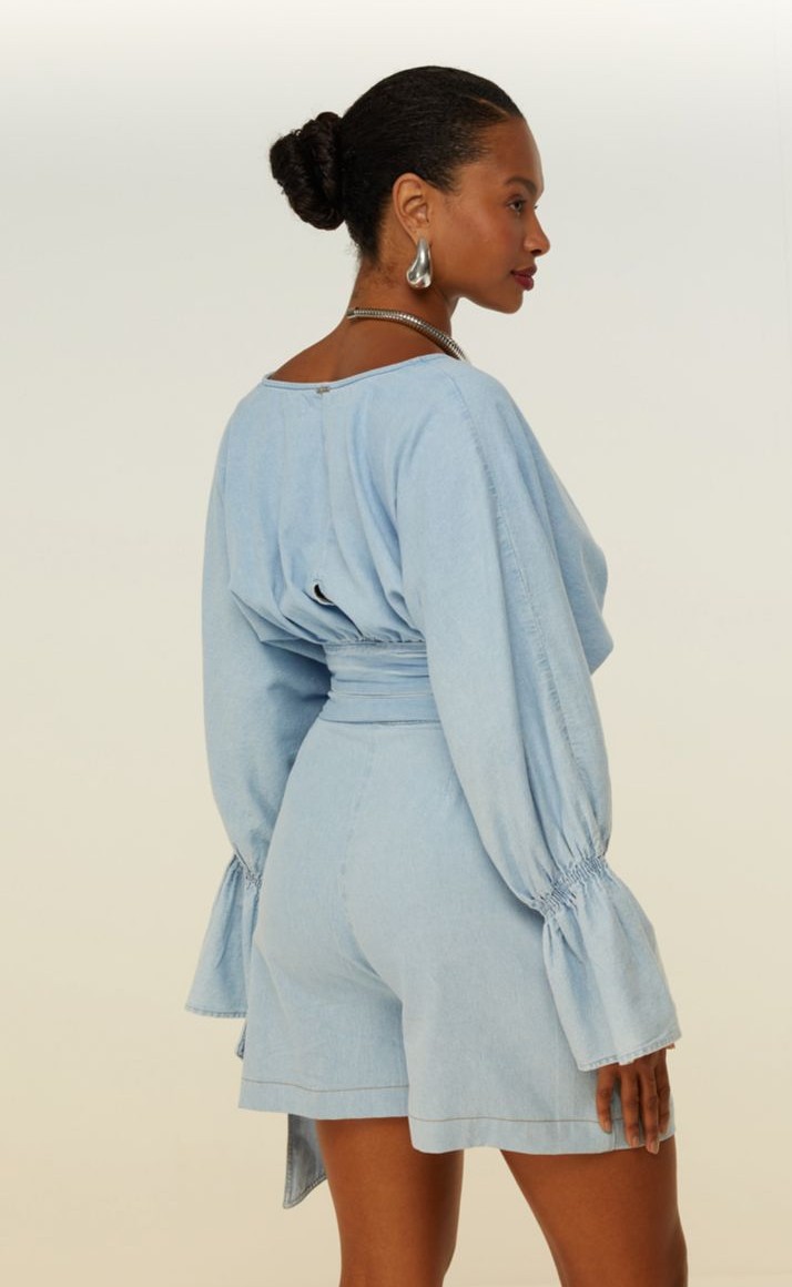 Bermuda Alfaiataria Com Laço com cintura alta e cinto-faixa no mesmo tecido, que permite um laço charmoso na amarração, ela tem modelagem reta e acabamento refinado. O caimento estruturado valoriza a silhueta, tornando a peça versátil para composições formais ou casuais.
