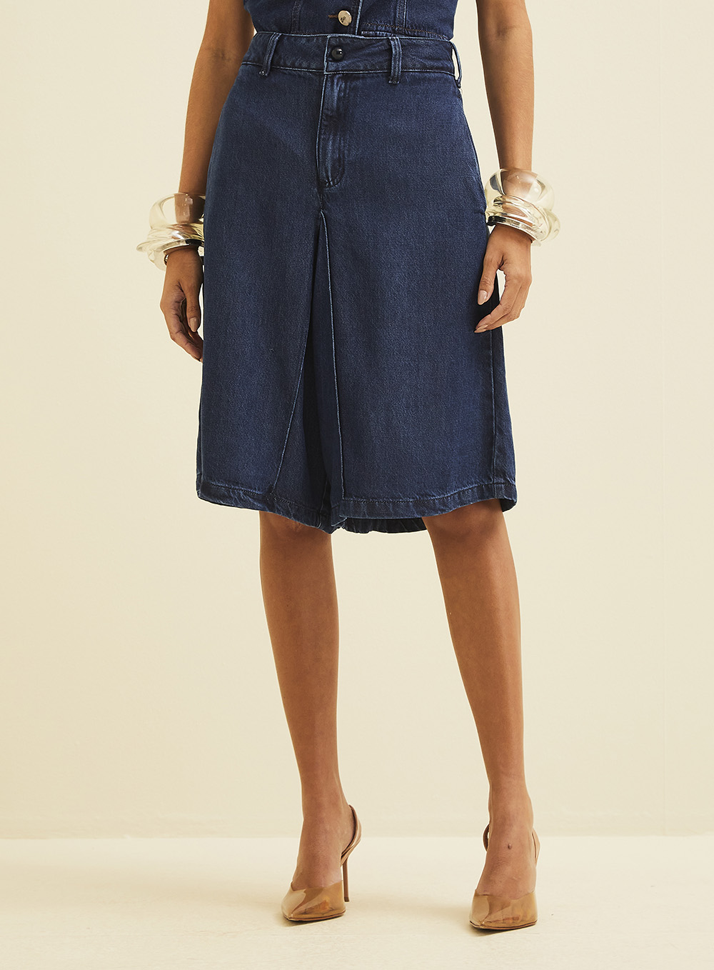 Bermuda Jeans Feminina Em Alfaiataria – VACATION – SUMMER 26PORQUE AMAMOS:Nascida da fusão entre a alfaiataria e o denim, esta bermuda é a peça que captura a alma inovadora e sofisticada da coleção Vacation Summer 26. Sua silhueta ampla, que lembra uma saia-calça, e o caimento impecável do liocel são um convite para desacelerar o tempo e viver com mais fluidez. A lavagem escura e a prega frontal traduzem o luxo silencioso de uma peça que é ao mesmo tempo despojada e altamente elegante, celebrando o bem-estar de um estado de férias permanente.COMO É:Bermuda: Modelagem de alfaiataria com pernas bem amplas (pantalona) e comprimento que vai até os joelhos. Possui cintura alta que valoriza a silhueta, uma prega macho frontal que garante o volume e o movimento, e bolsos faca laterais.