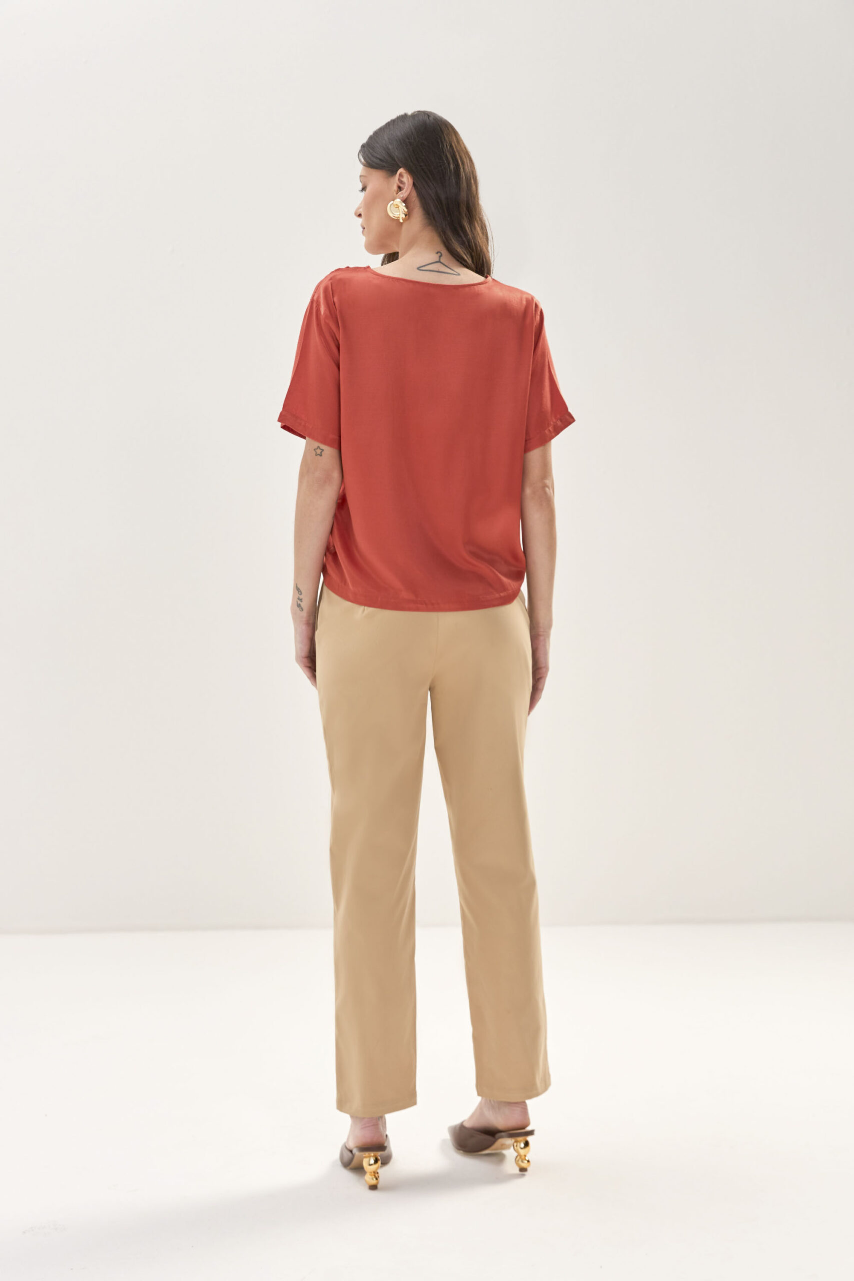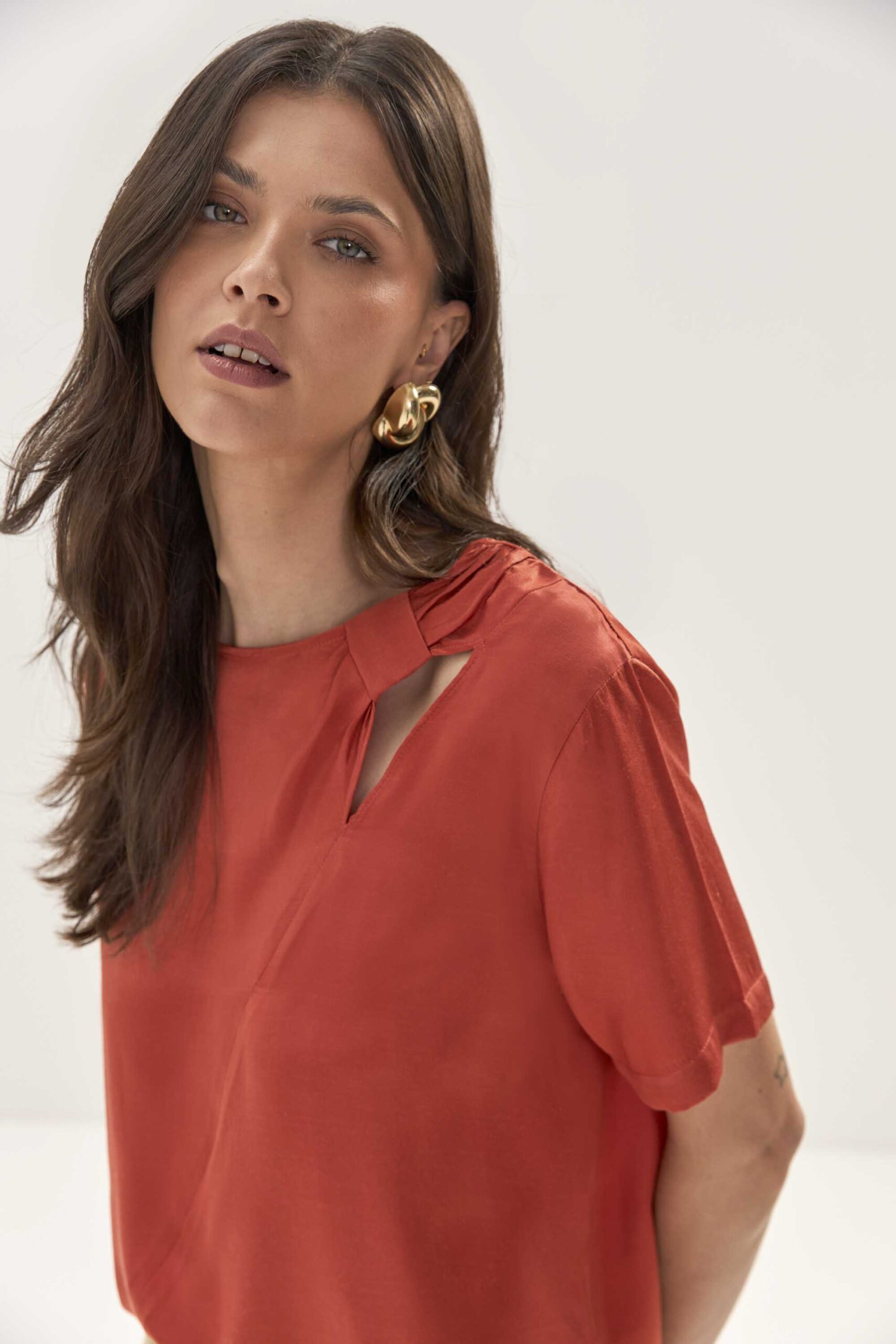Blusa em modelagem leve e elegante, com detalhe de elo no decote que traz charme e sofisticação ao visual. Versátil e moderna, é a peça ideal para compor produções que transitam do dia à noite com estilo.