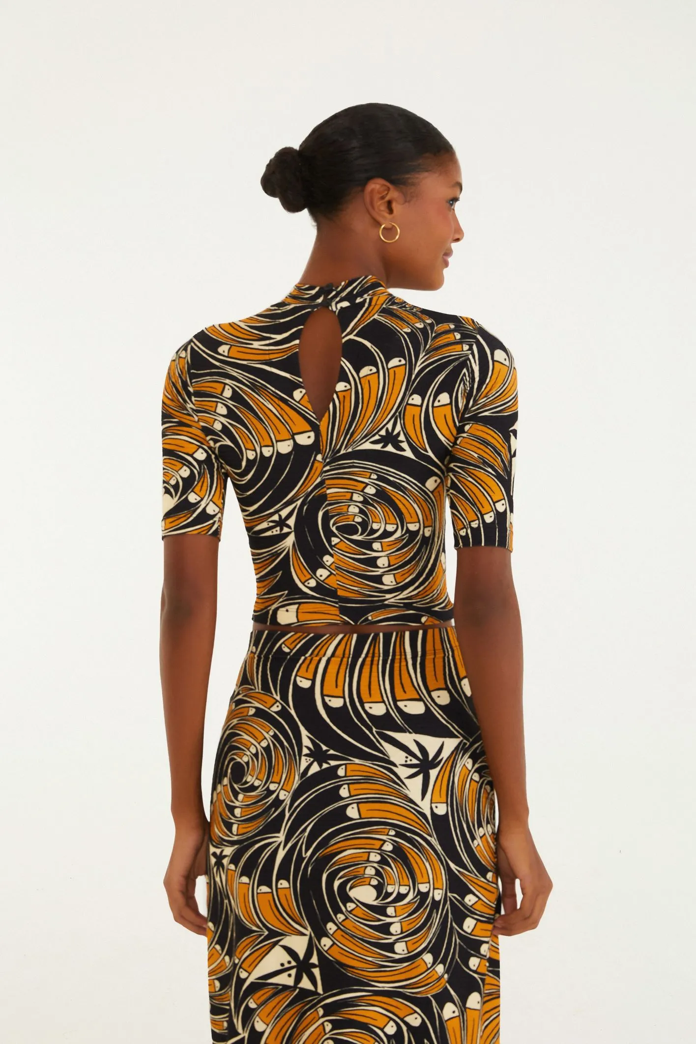 Blusa Cropped Estampada Leque De Tucano possui decote redondo que valoriza o colo e mangas curtas que proporcionam leveza.