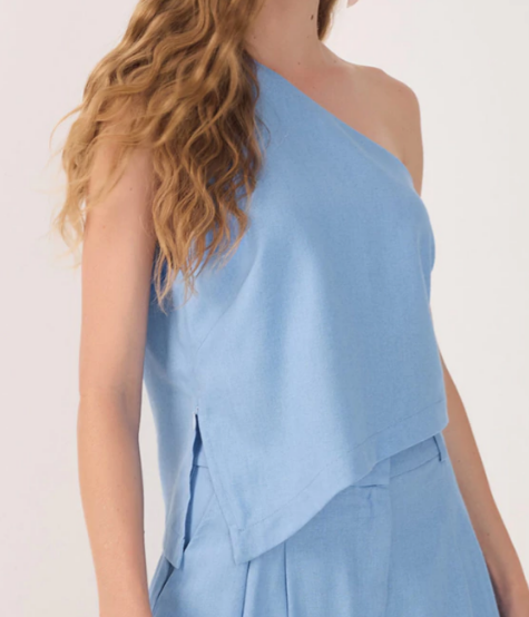 Blusa Linho Assimétrica Ombro Só com design de um ombro só que valoriza a silhueta de forma elegante. O corte assimétrico traz um toque de estilo contemporâneo, ideal para composições casuais ou mais sofisticadas.