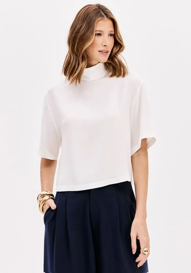 Confeccionada em tecido plano e leve de viscose, a blusa de mangas curtas tem caimento solto no corpo, gola alta e fechamento posterior por botão. Seu corte versátil transita com facilidade entre looks formais e casuais. Essencial no closet!