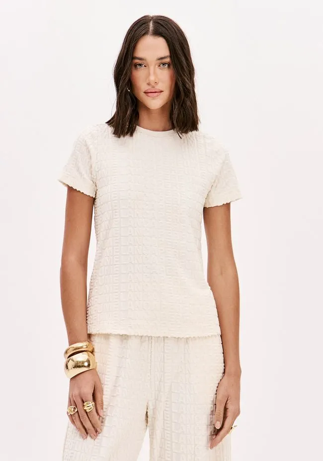 A blusa é confeccionada em malha encorpada com assinatura lança perfume em relevo. Possui gola redonda, mangas curtas e caimento confortável no corpo. Perfeita para combinar com calça ampla e criar um visual sofisticado no dia a dia!