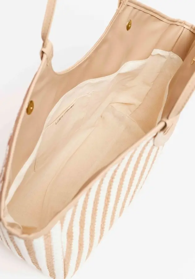 Bolsa ampla e prática, confeccionada em tecido estruturado com estampa de listras. Possui alças confortáveis para carregar no ombro e espaço interno generoso.
