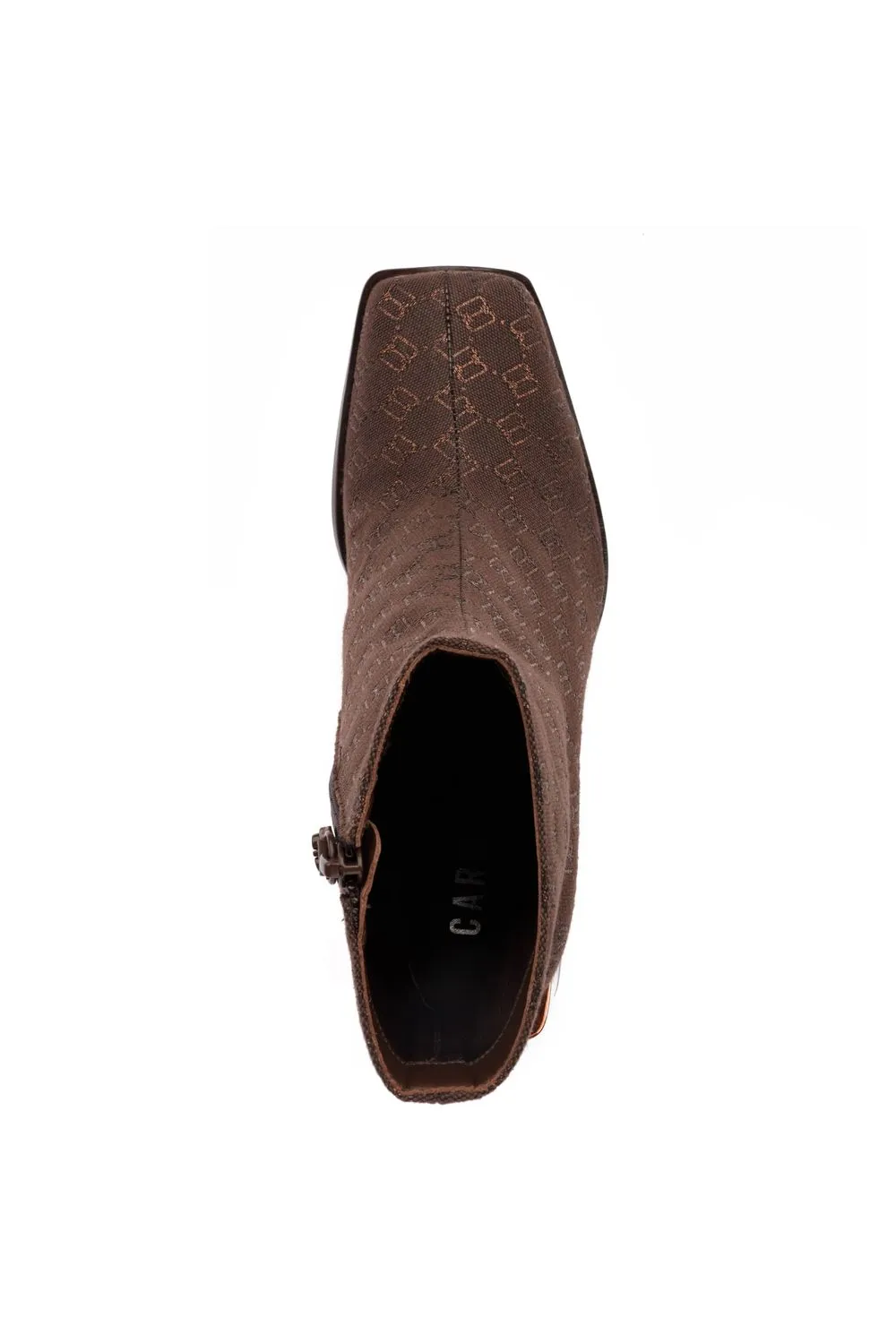 Bota Hungria em tecido jacquard com lurex. Construção de bico quadrado e salto bloco para maior estabilidade,salto cromado e fechamento com zíper.