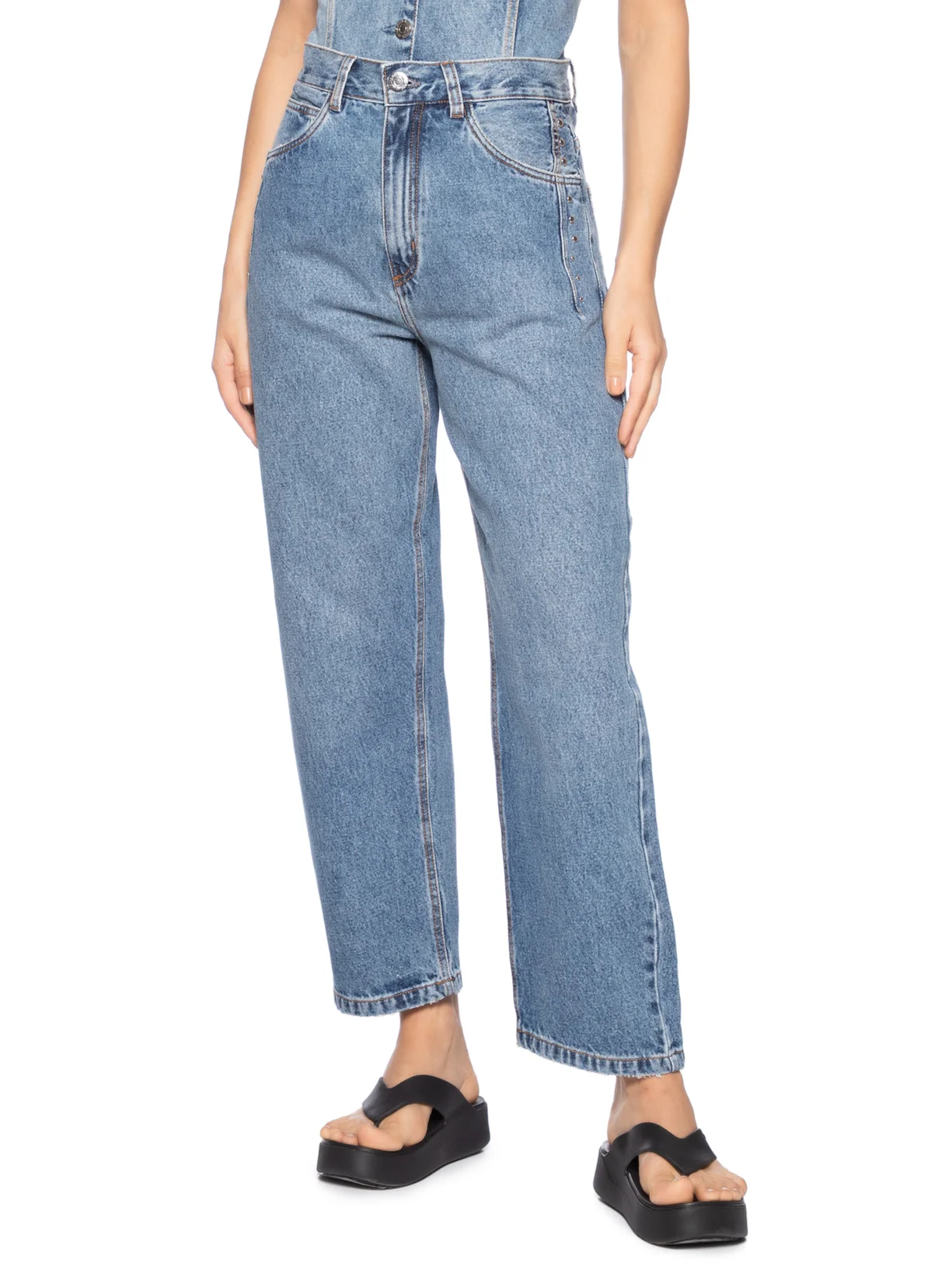 Calça Feminina Jeans Nipper Detalher Tachas possui cintura alta, cós com passantes, five pockets, tag da marca aplicada na parte posterior, detalhe de tachas.