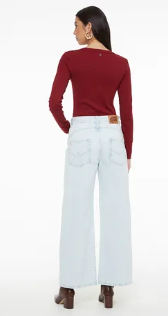 Calça Jeans Wide Leg Baby Blue possui cintura alta com passantes, fechamento em botão e zíper, além de bolsos cinco pockets para funcionalidade. A perna ampla alonga a silhueta com elegância e conforto.