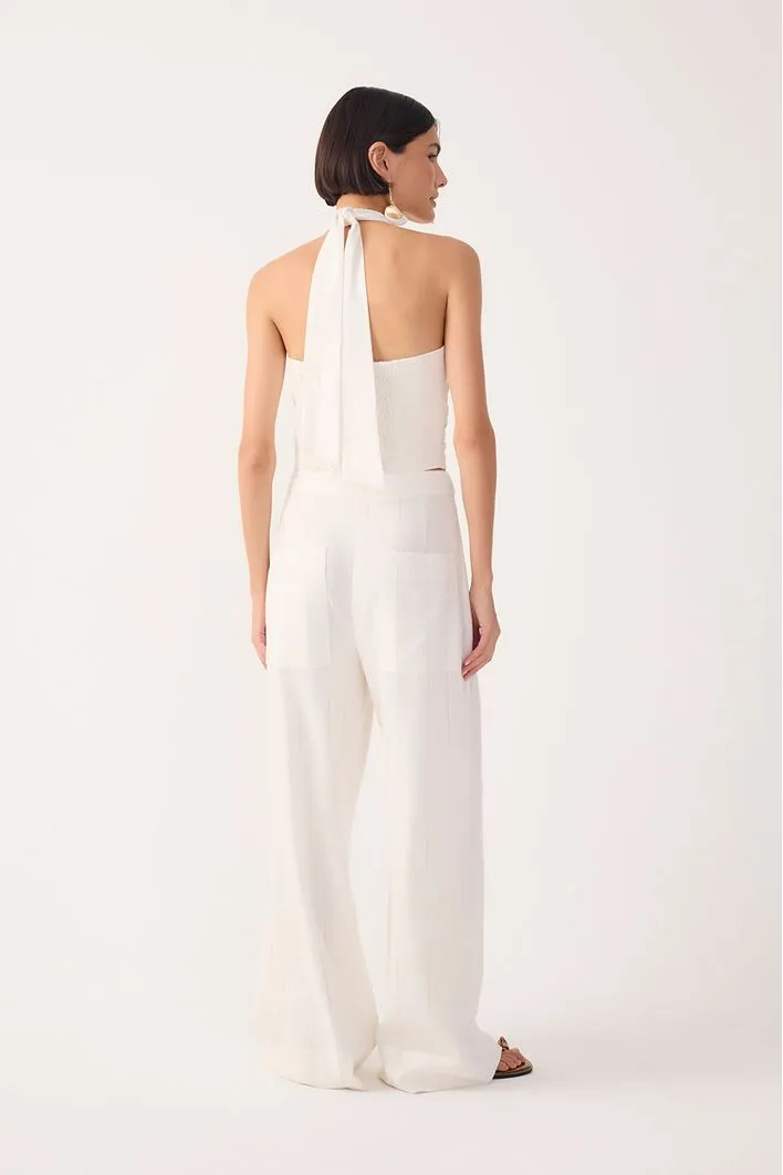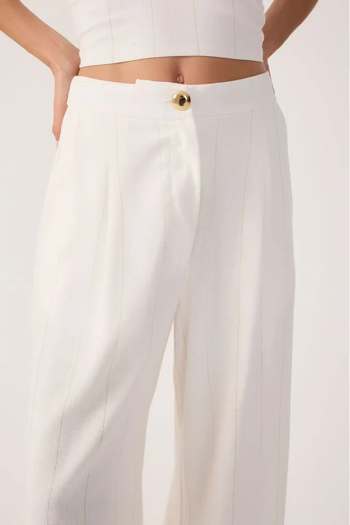 A Calça Linho Risca Lurex une o toque natural do linho ao brilho discreto do lurex.