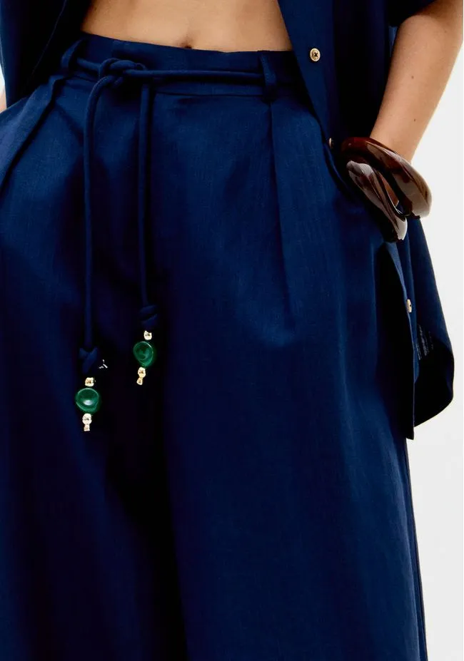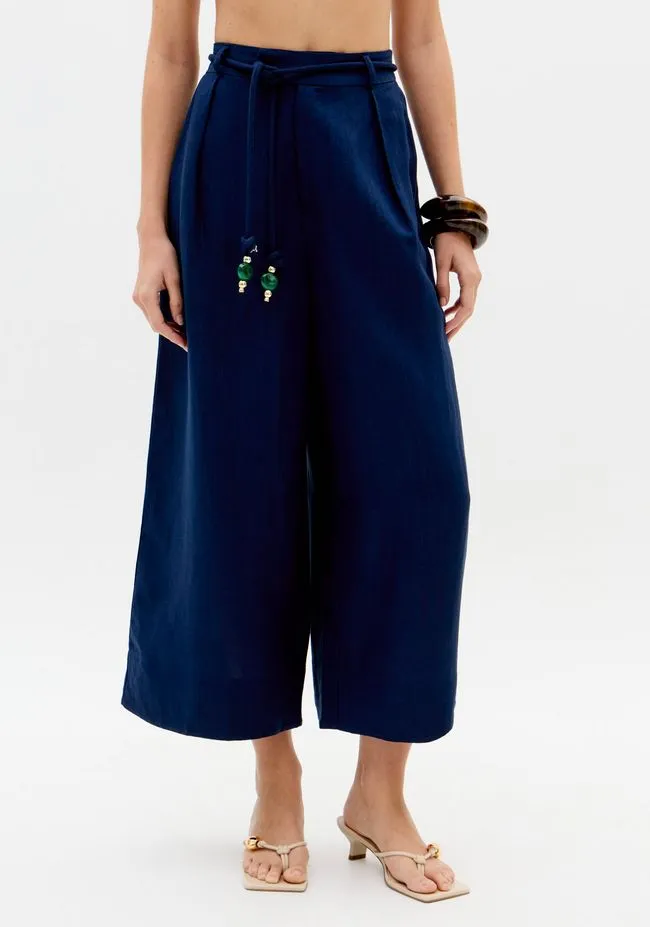 A calça pantacourt de cintura alta é confeccionada em tecido encorpado com linho e apresenta caimento solto nas pernas. Conta com bolsos funcionais, fechamento por zíper e gancho interno, além de cinto de cordão com ponteiras que valorizam o modelo