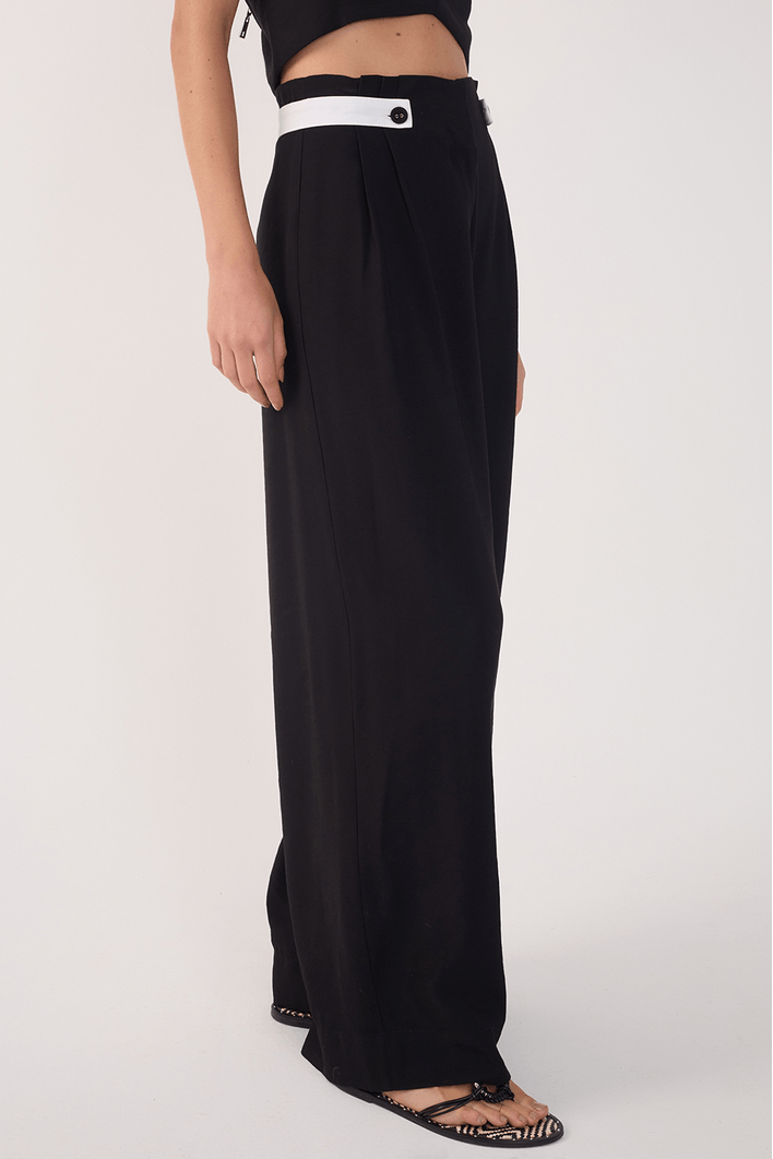 Calça Recorte Cós Algodão conta com cintura alta e modelagem pantalona, alonga a silhueta e caimento fluido. O destaque fica por conta do cós com aleta lateral.