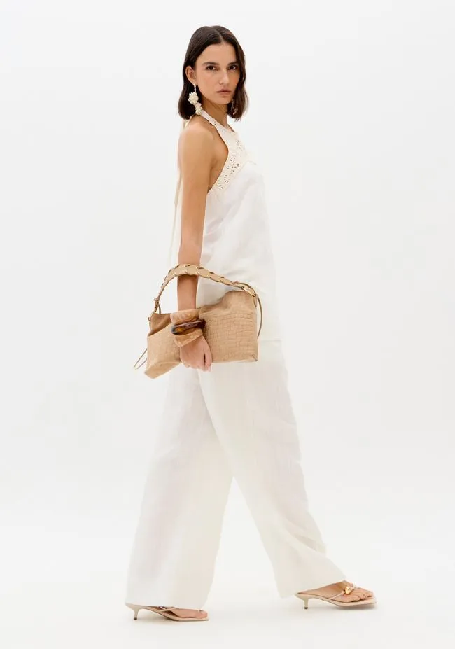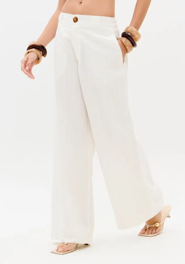 A calça é feita em tecido encorpado com linho e modelagem reta que desce solta do quadril até a barra. Apresenta cintura alta, passantes no cós, bolsos funcionais e fechamento por botão e zíper. uma escolha atemporal que supera qualquer tendência!
