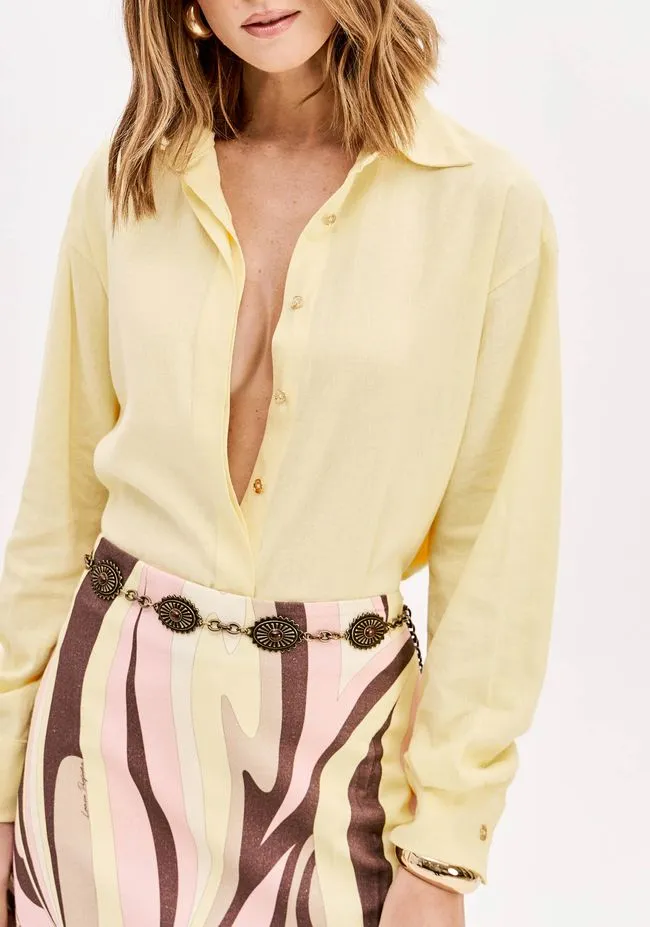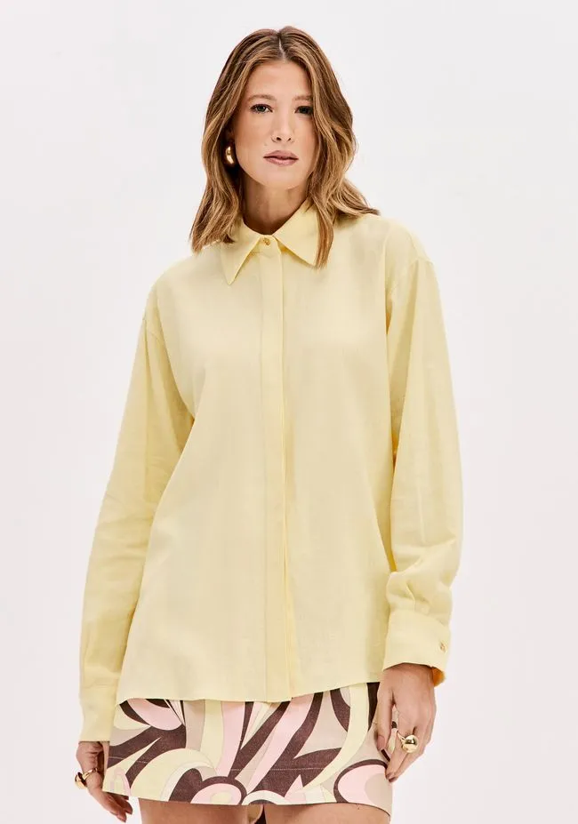 A camisa de mangas longas é feita em tecido leve com linho e sem elasticidade. Traz modelagem alongada, gola tradicional e fechamento frontal por botões. O caimento solto no corpo reforça o visual leve e elegante da peça. Use em propostas sofisticadas!