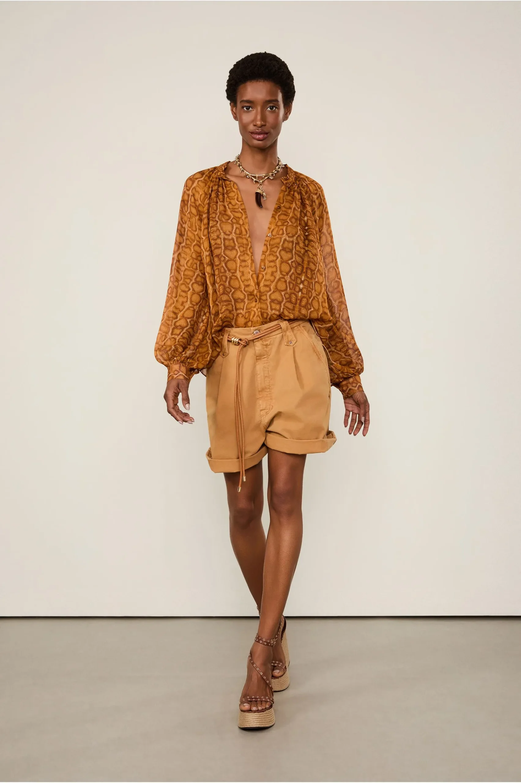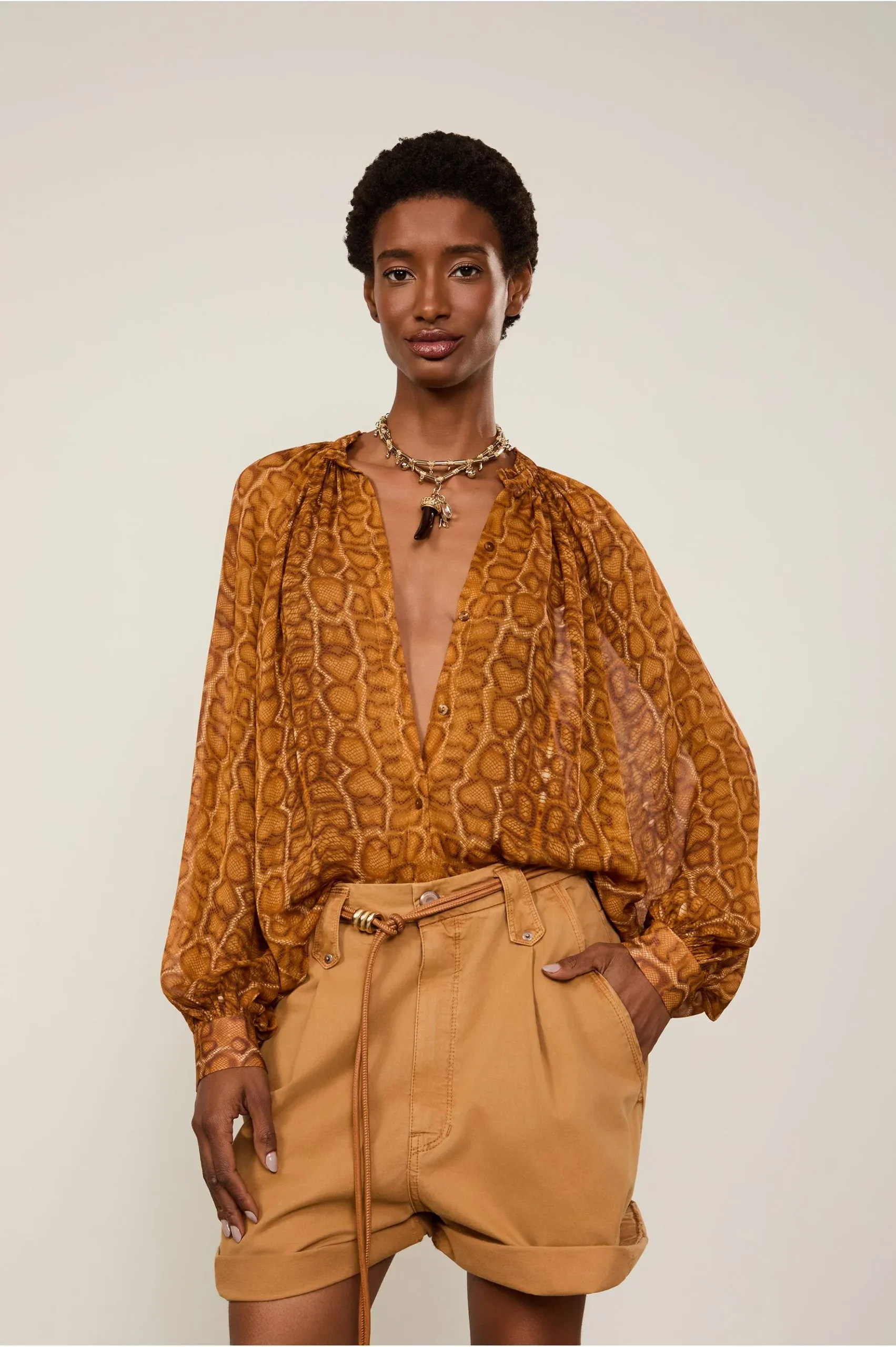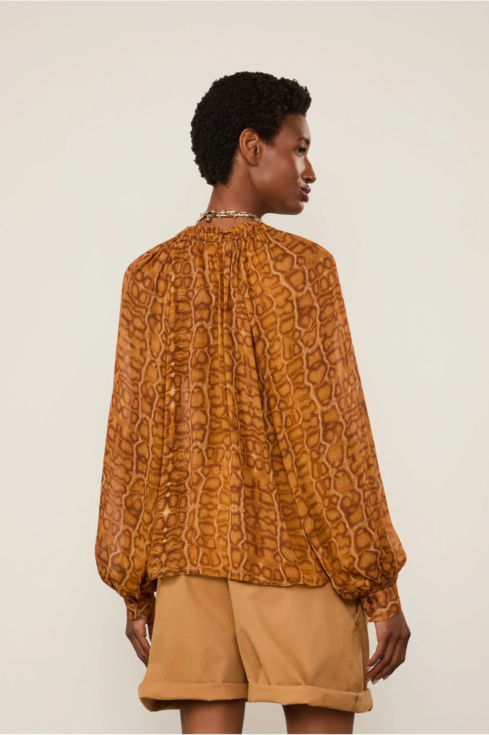 A Camisa Estampada possui mangas longas e amplas, fechamento por abotoamento frontal, gola padre com decote franzido e comprimento clássico. Must-have em todas as estações, traduz sofisticação e personalidade para composições contemporâneas.