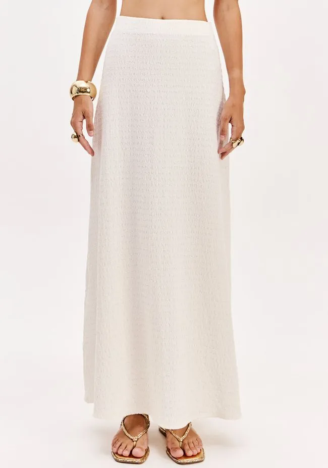 Saia Super Midi em malha texturizada ajusta-se na parte superior e se abre com fluidez na base. O elástico no cós garante conforto sem comprometer o visual sofisticado da peça.