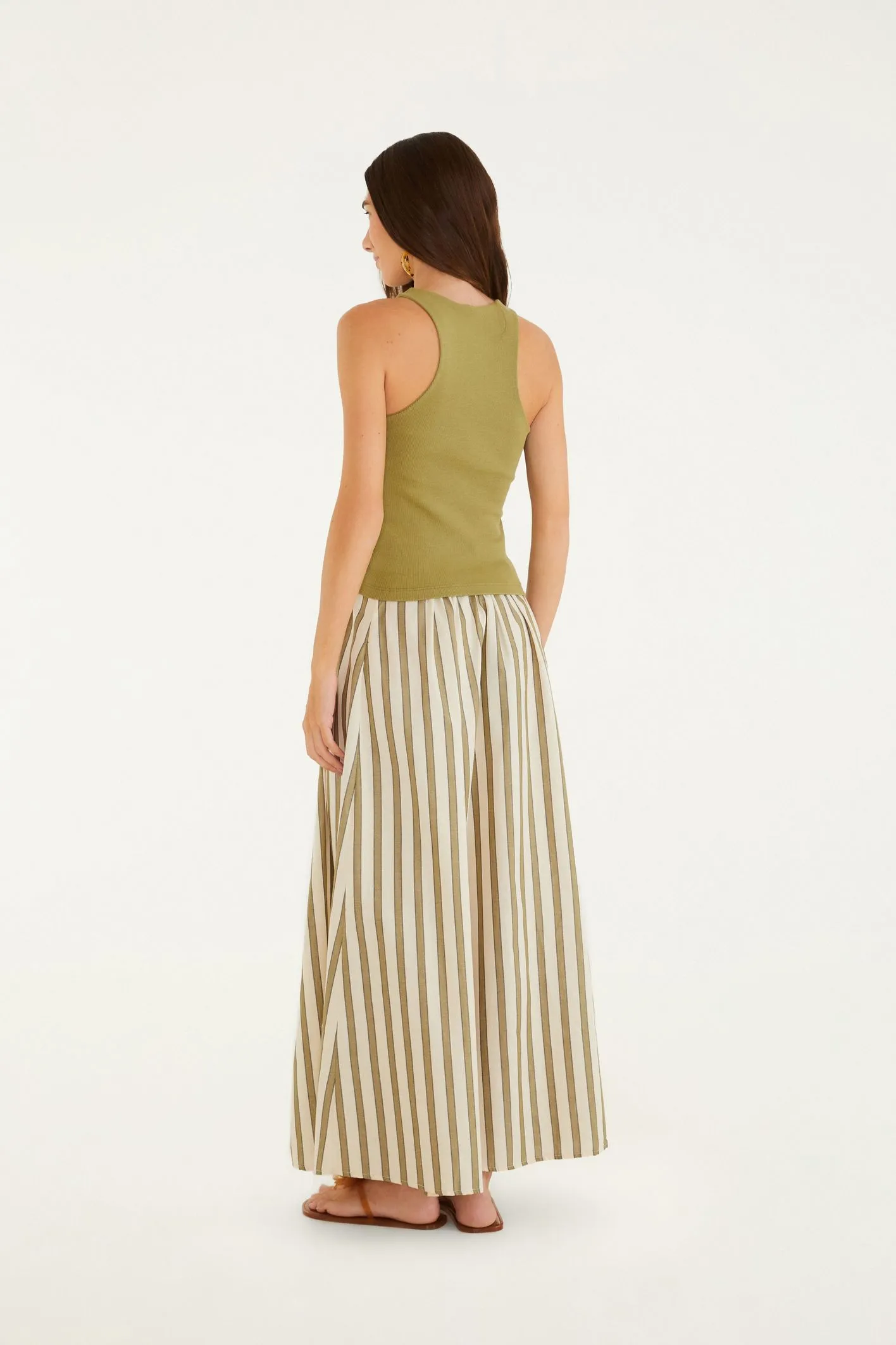 Saia Listra Morerê confeccionada em tecido leve, essa saia longa possui corte fluido que proporciona movimento a cada passo. Cintura ajustada.