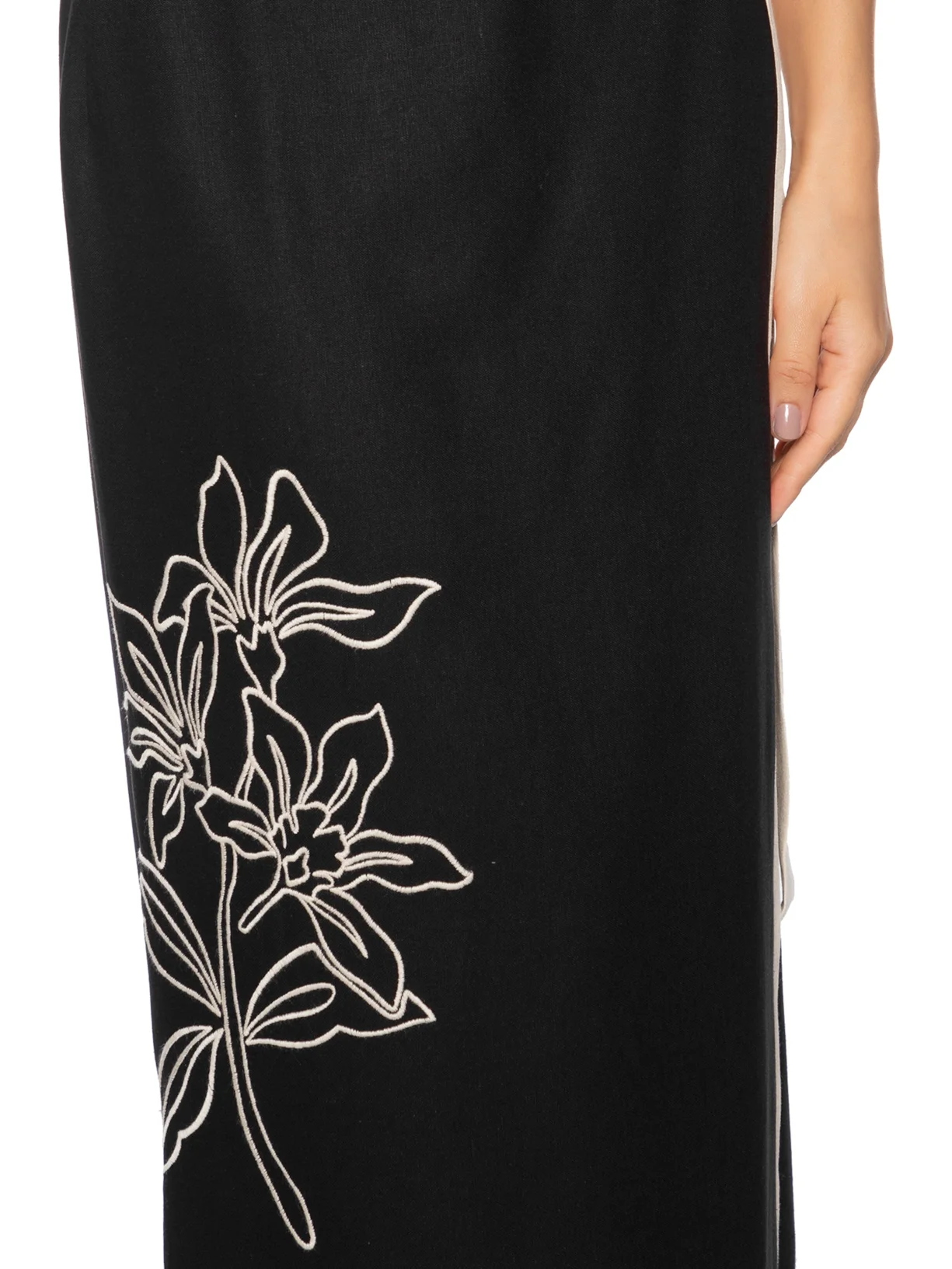 A saia preta é confeccionada em tecido leve com toque de linho. A peça solta ao corpo possui cintura alta, bolsos frontais modelo faca, recorte lateral e faixa média alongada em cor contrastante, tecido transpassado na parte frontal, bordado floral em cor contrastante aplicado na parte floral, forro, comprimento midi e fechamento lateral por amarração.
