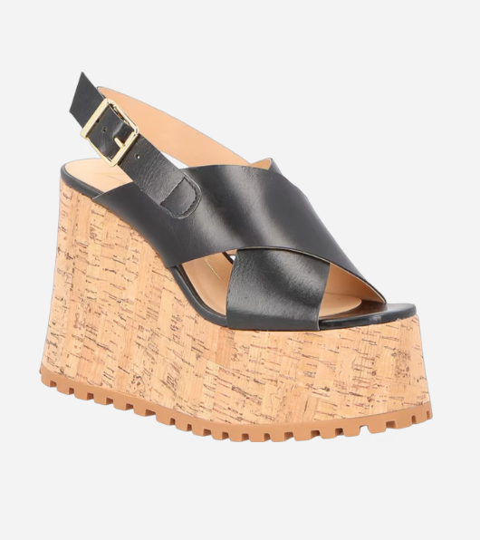 A sandália possui plataforma alta em cortiça, cabedal com duas tiras largas cruzadas em couro no tom preto, possui uma tira com fivela para ajuste no tornozelo.