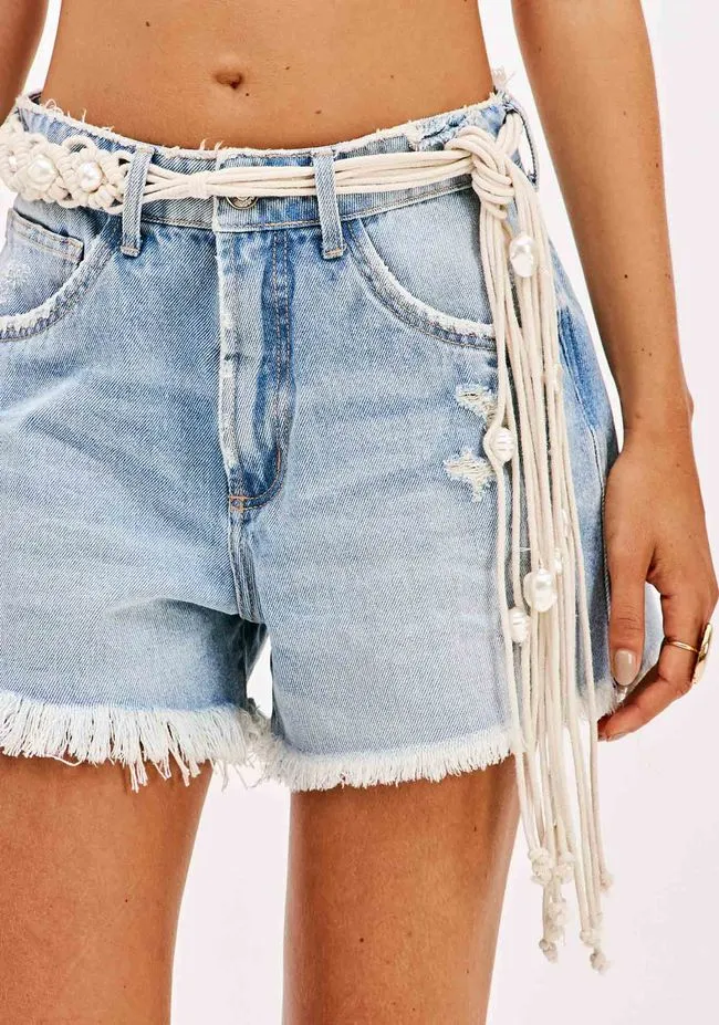 Short Jeans Comfort Cintura Alta conta com bolsos funcionais, barras desfiadas e fechamento tradicional com botão e zíper.