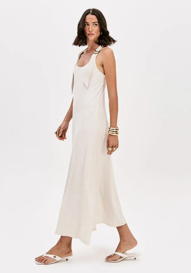 O vestido super midi feito em malha canelada com toque de linho aposta na modelagem evasê que se amplia suavemente até a barra. Com decote redondo, alças complementadas por argolas e caimento solto no corpo, é a peça ideal para looks leves e elegantes!