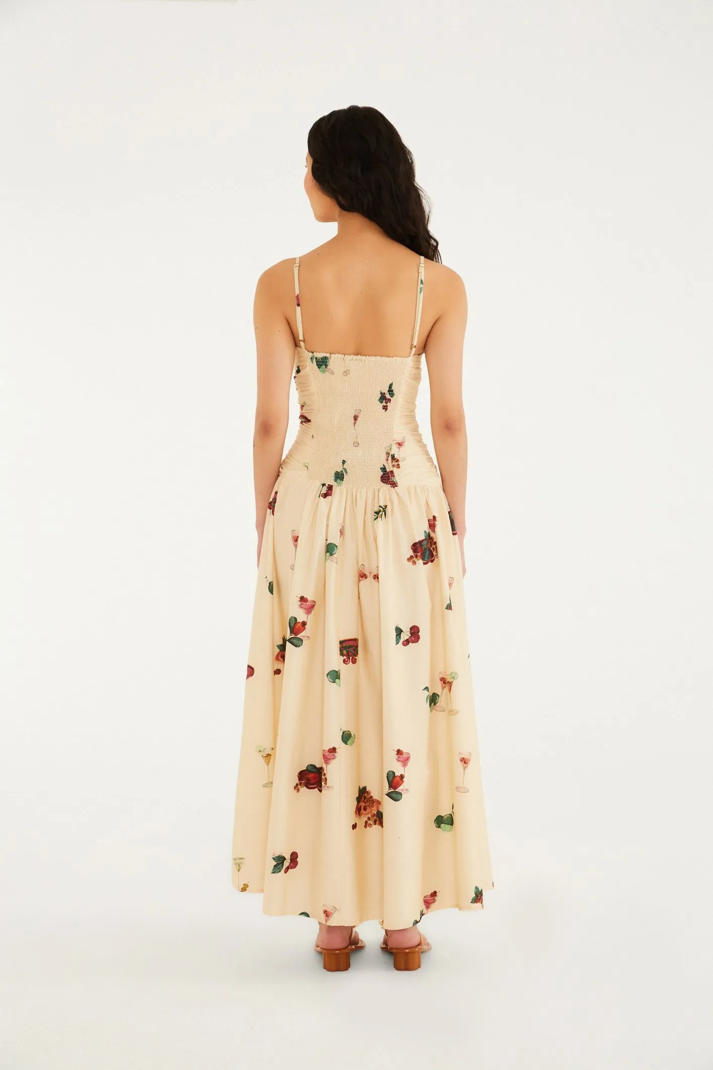 Vestido Cropped Estampado Coquetel Tropical com decote em coração e alcinhas finas, traz leveza e fluidez. a saia evasê possui caimento solto e delicado, perfeito para ocasiões casuais e passeios ao ar livre.