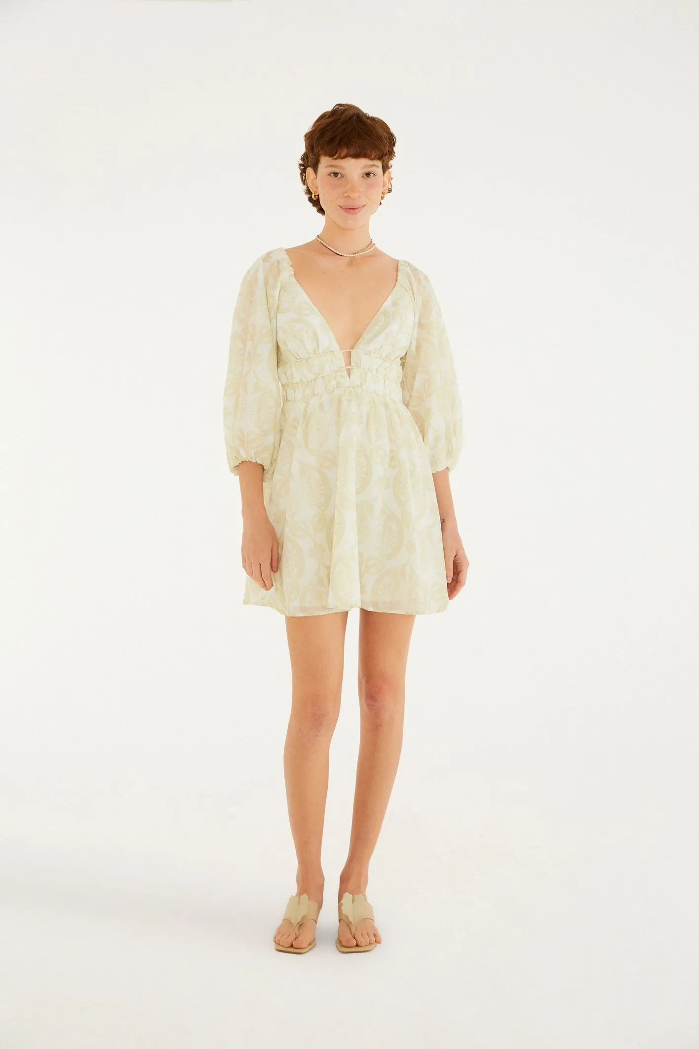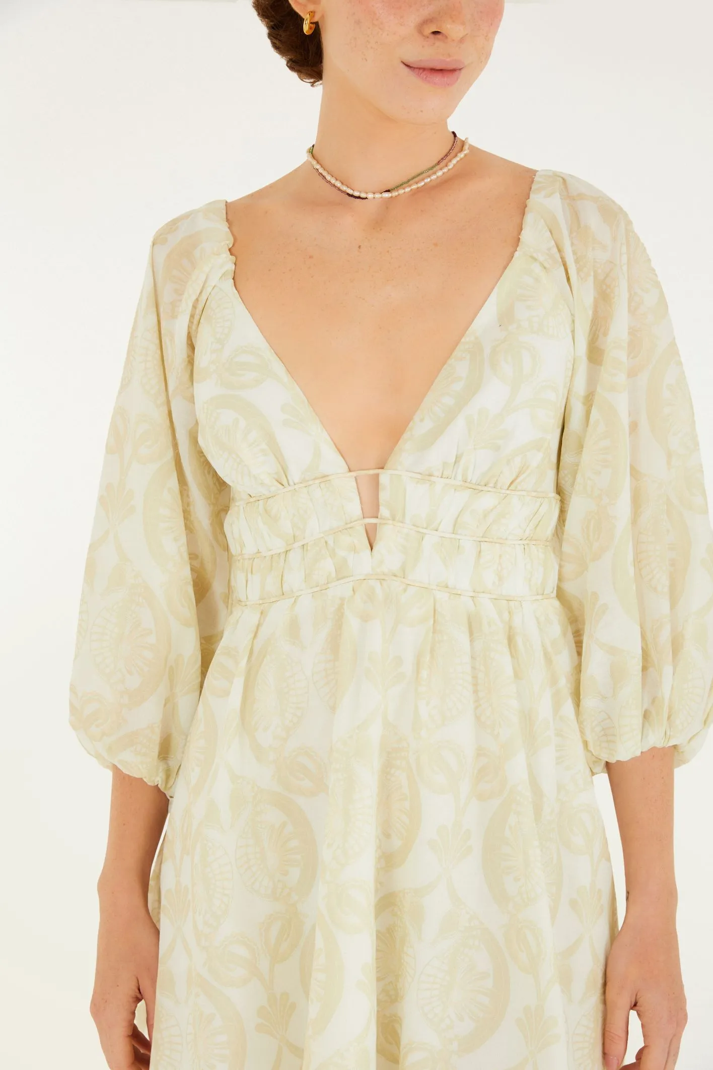 vestido curto estampado cavalos marinhos. possui decote profundo em v, conferindo leveza e movimento. mangas bufantes com elástico nos punhos, garantindo um estilo casual. a cintura é demarcada por um ajuste sutil. perfeito para dias ensolarados ou um passeio à beira-mar.