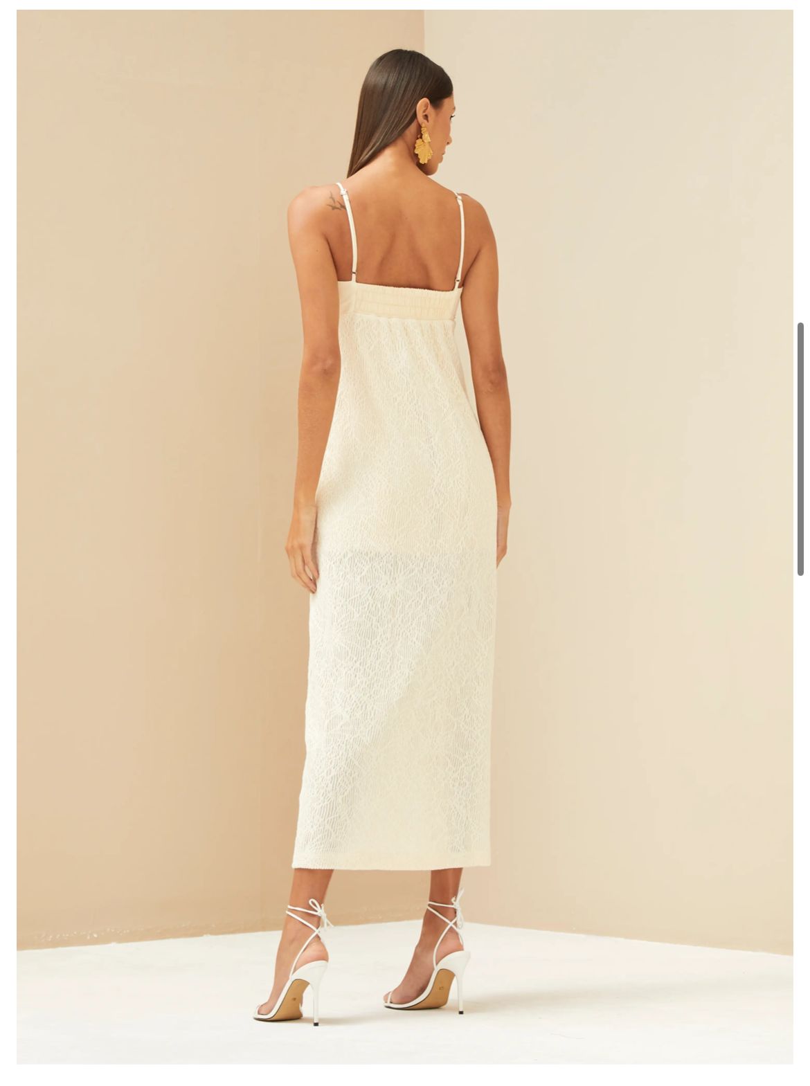 Vestido Longo Bege Affogato. Confeccionado em tecido leve e com forro interno, garante conforto e caimento impecável. As alcinhas de renda trazem um detalhe feminino e sofisticado, tornando a peça perfeita para ocasiões especiais ou eventos diurnos.