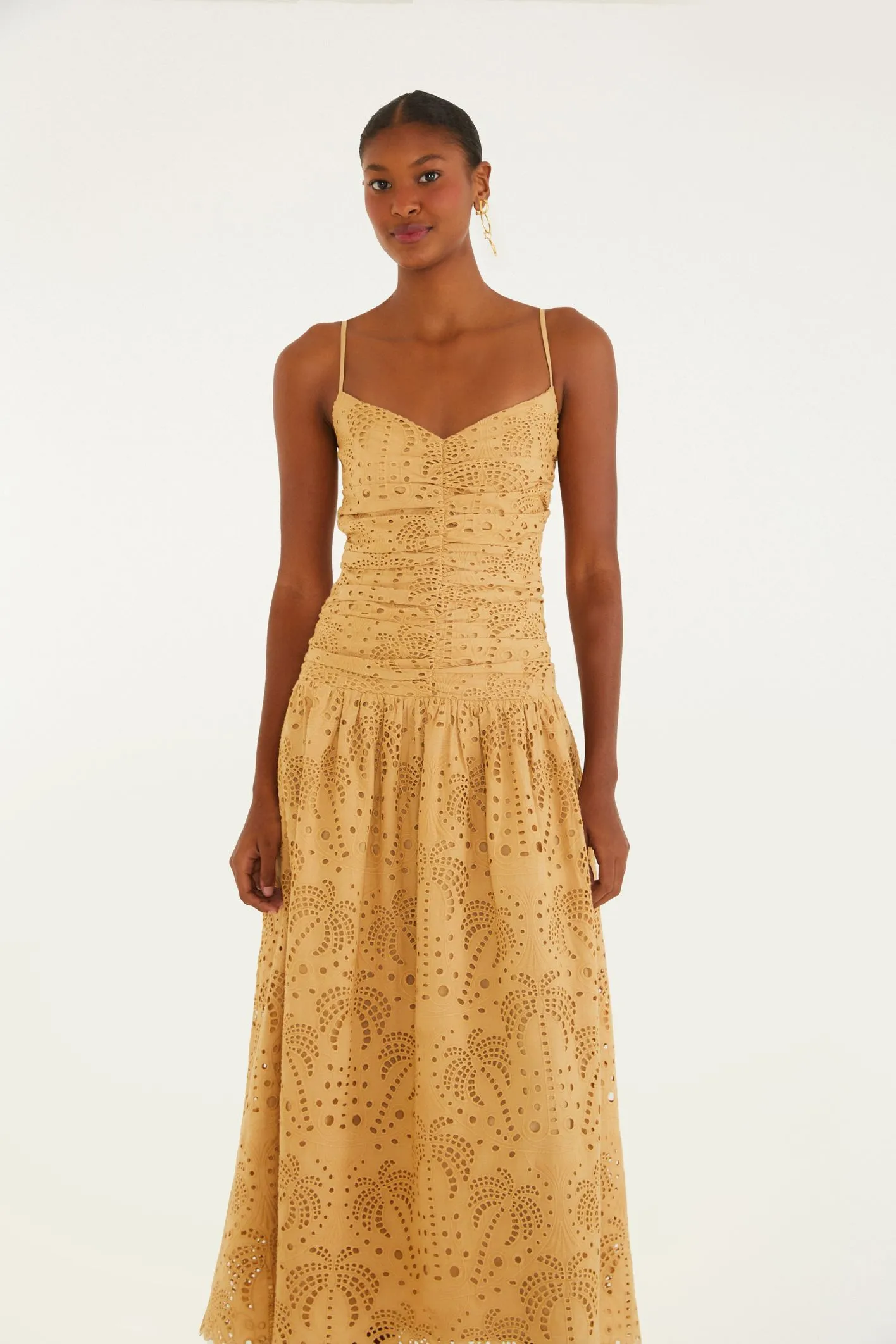 Vestido Franzido Afrodite com alças finas e decote em coração, a modelagem fluida permite leveza e conforto, enquanto os detalhes franzidos elevam o estilo.