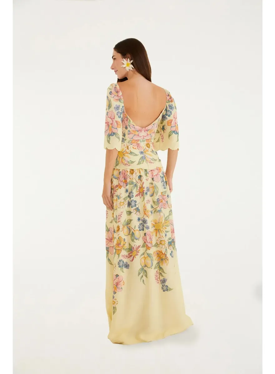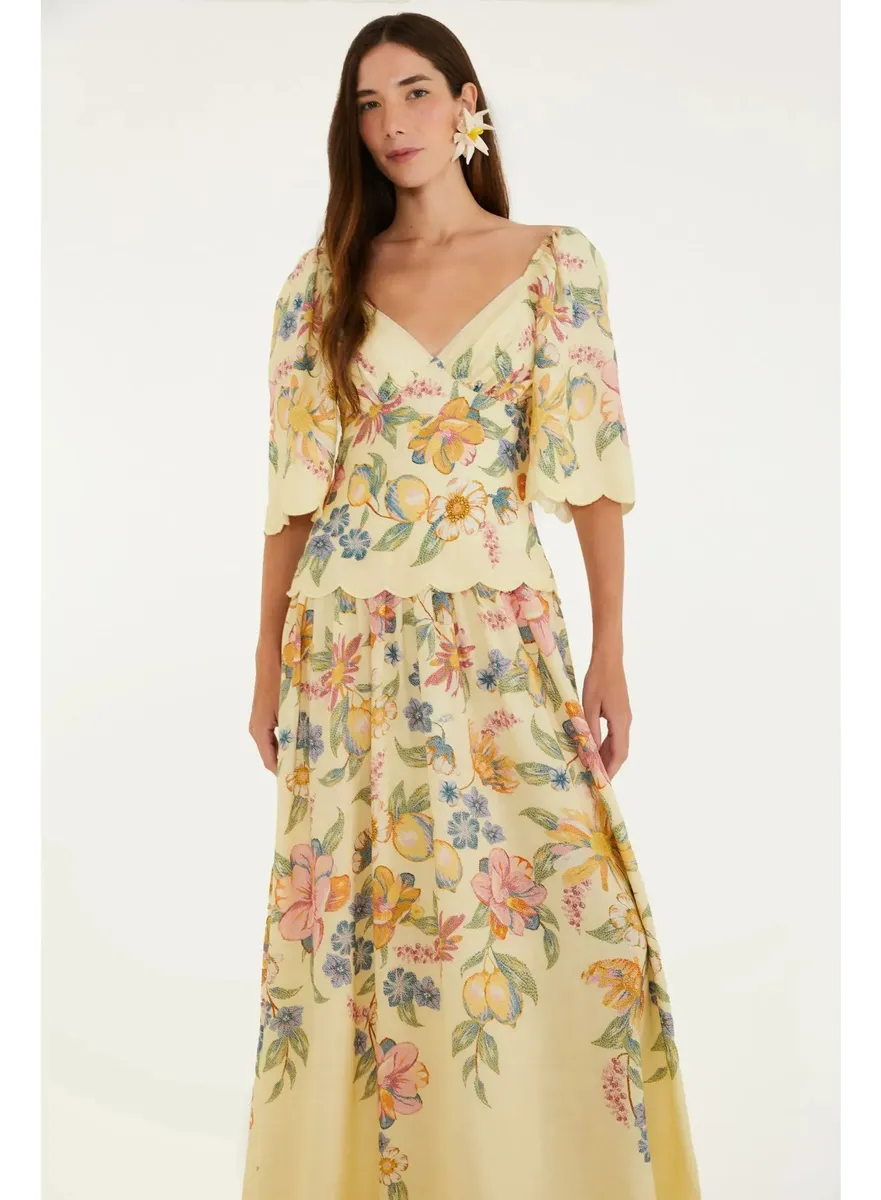 Vestido longo estampado festone maira lenço apresenta decote em v, mangas bufantes até o cotovelo e cintura marcada por elástico delicado. a saia fluida cria um movimento encantador, perfeito para um dia especial ou um passeio casual. tecido leve que oferece conforto e frescor em qualquer ocasião.