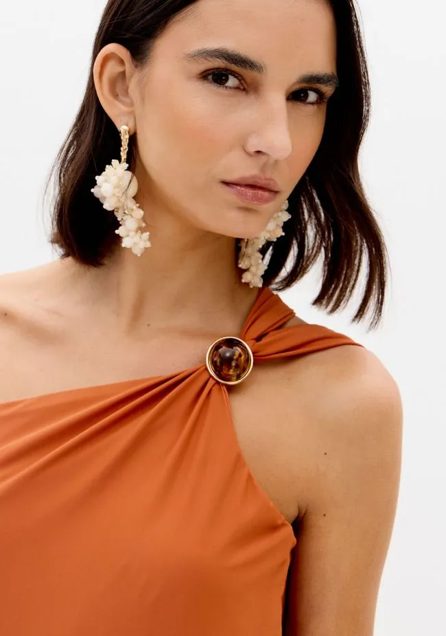 O vestido longo é confeccionado em malha leve e macia. Apresenta modelagem ombro único adornada por passante sofisticado, caimento solto ao corpo e barra cortada a fio. A escolha certa para um visual elegante e contemporâneo!
