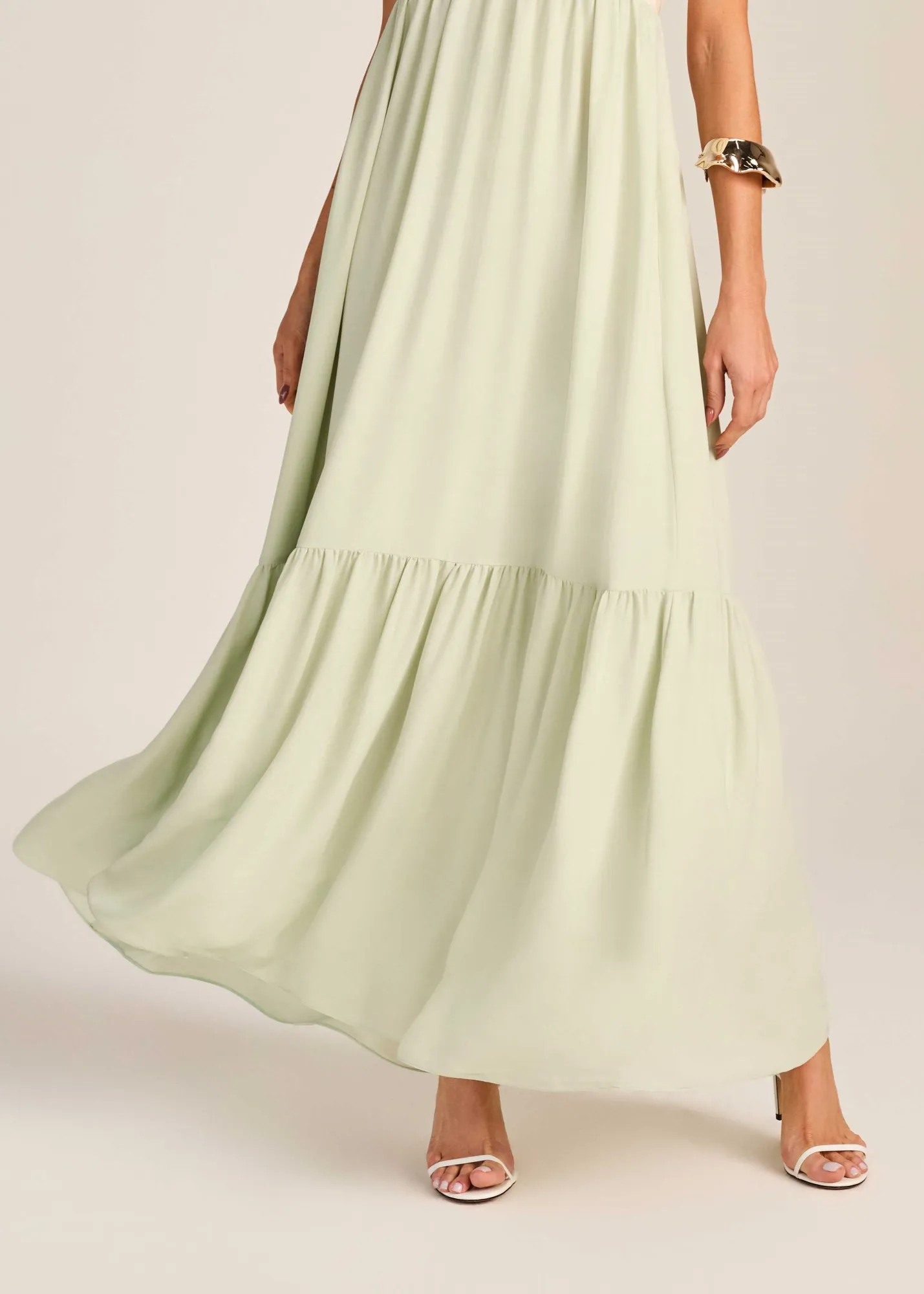 Vestido Longo Sem Alças com design elegante que valoriza o colo e alonga a silhueta. O busto plissado adiciona textura e charme ao visual.