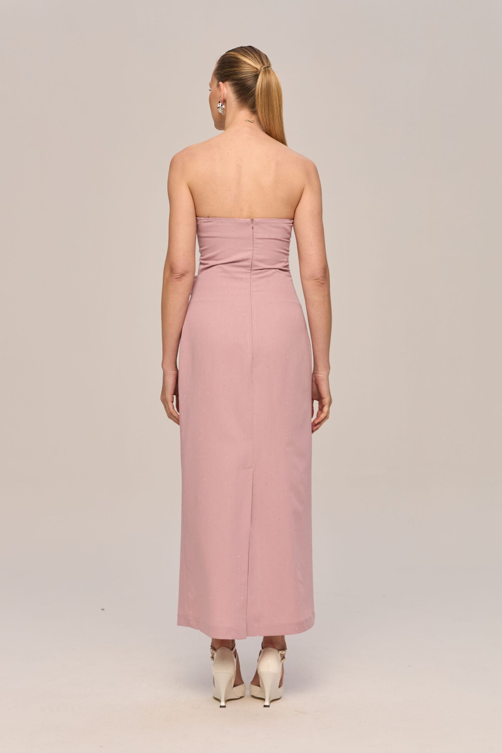 Vestido midi de modelagem justa que valoriza a silhueta, sem alças, com detalhes em strass que adicionam brilho e sofisticação.