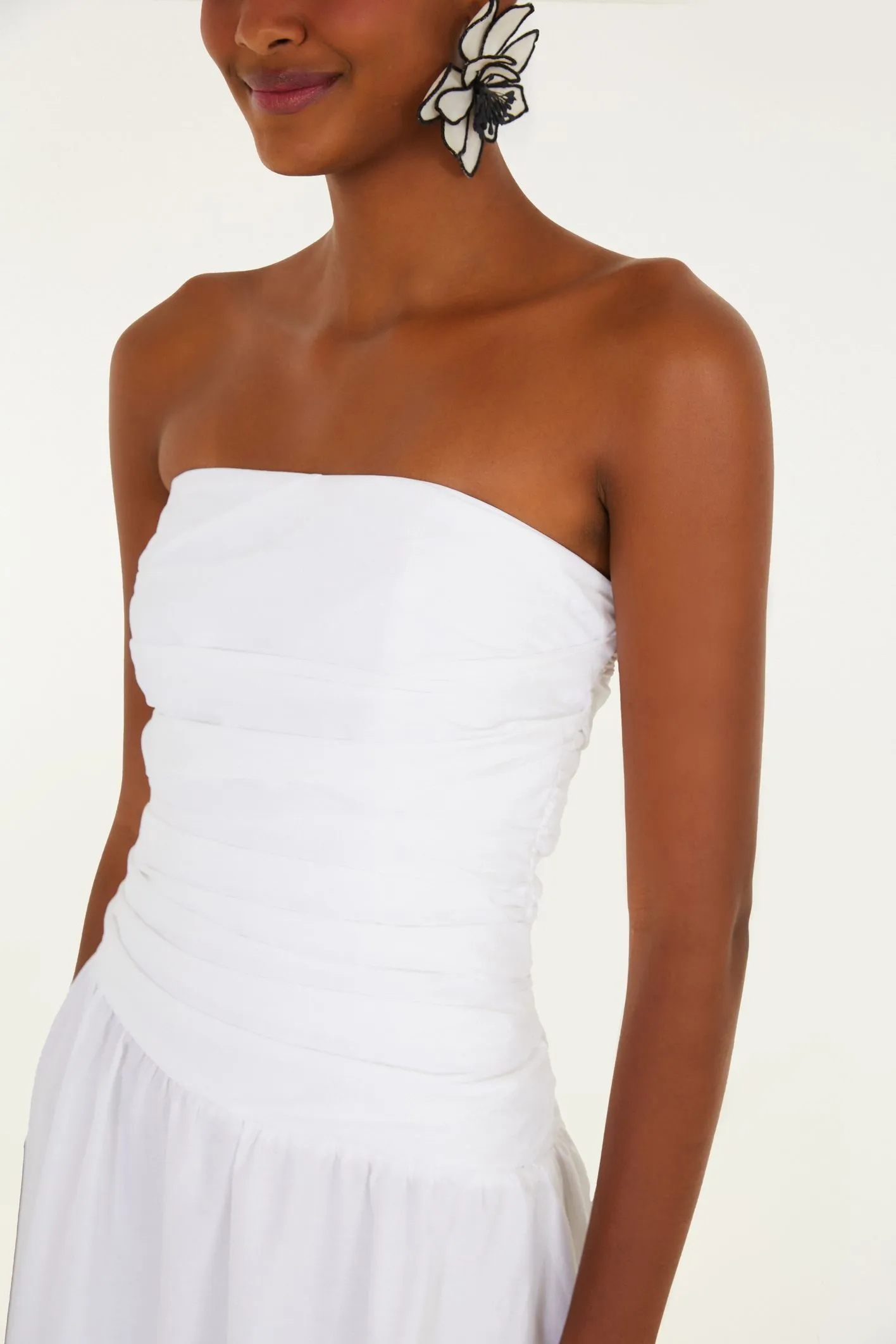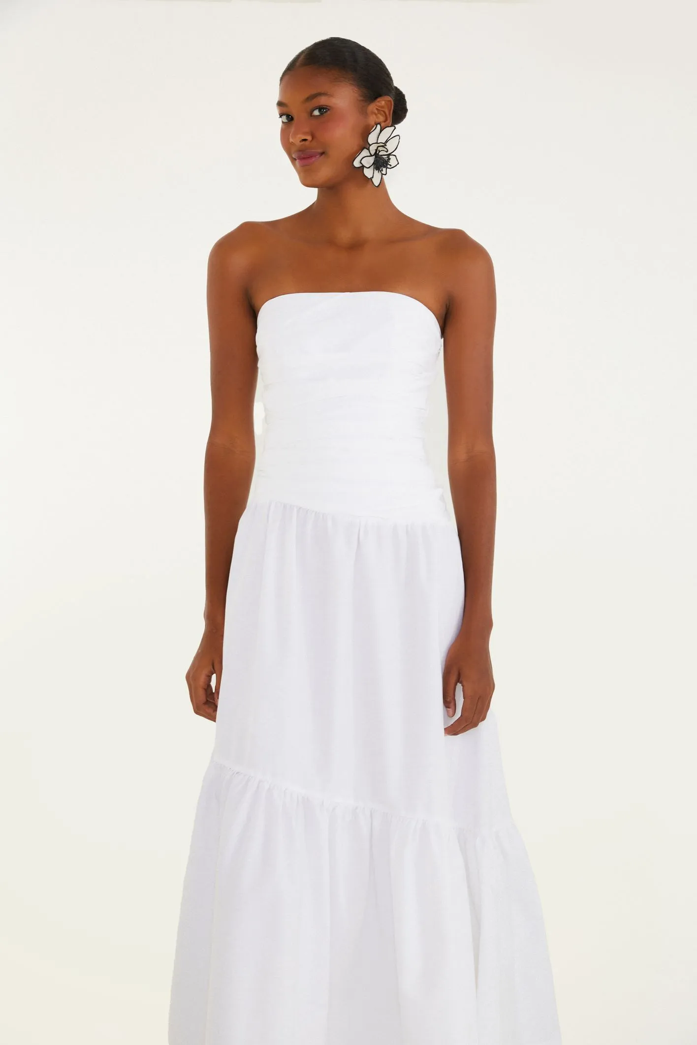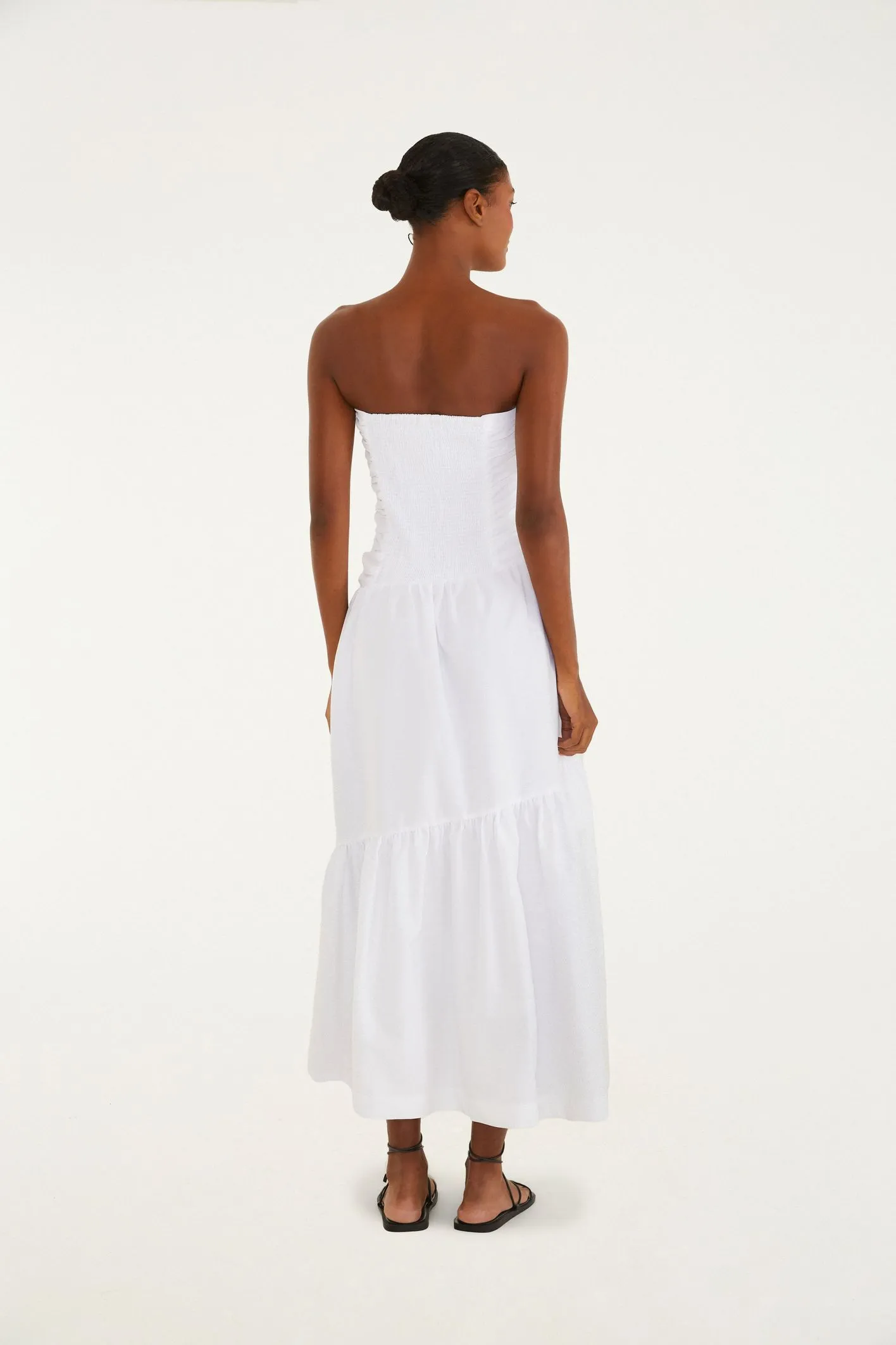 Vestido Sem Alça Franzido com design casual, ele traz uma faixa franzida no busto, valorizando o caimento. A saia em camadas oferece movimento e leveza.