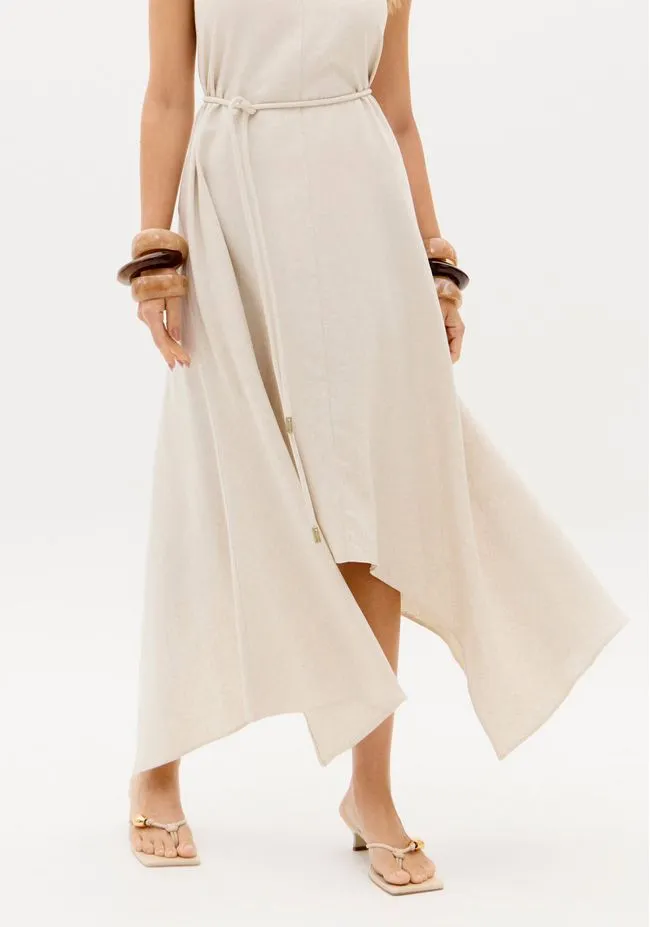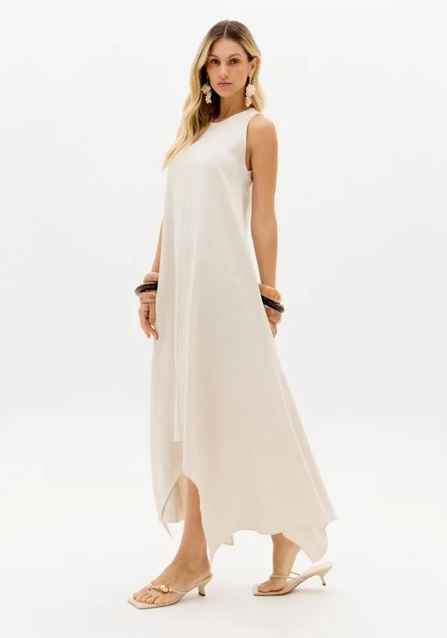 Feito em tecido encorpado com linho, o vestido super midi possui decote redondo, fechamento por botão e corte evasê que se abre levemente a partir do quadril. A barra assimétrica acrescenta fluidez e transforma a peça em aposta certeira para a temporada.