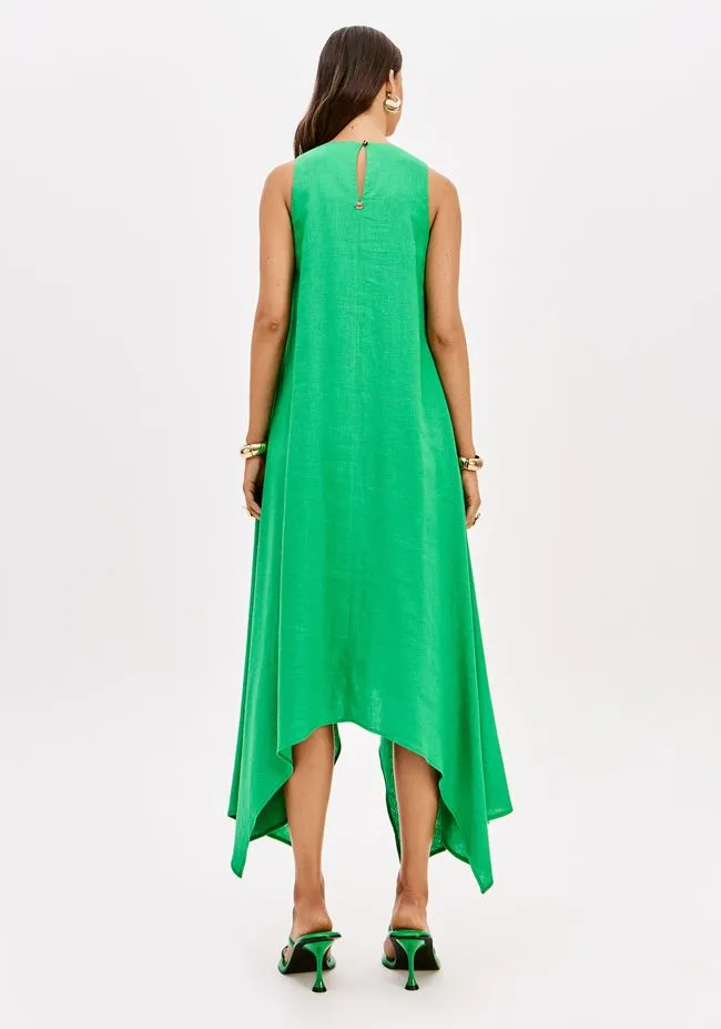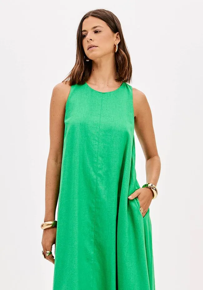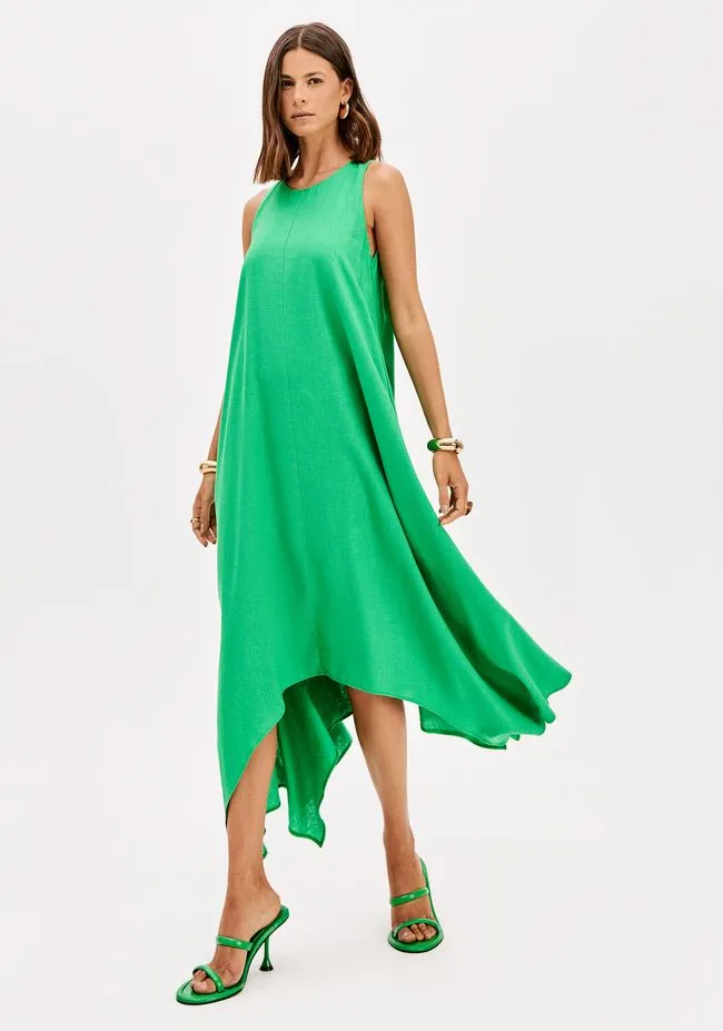 Confeccionado em tecido com linho de visual sofisticado, o vestido super midi traz modelagem assimétrica que garante movimento e atualiza as produções. O decote redondo e o fechamento posterior por botão completam o modelo.