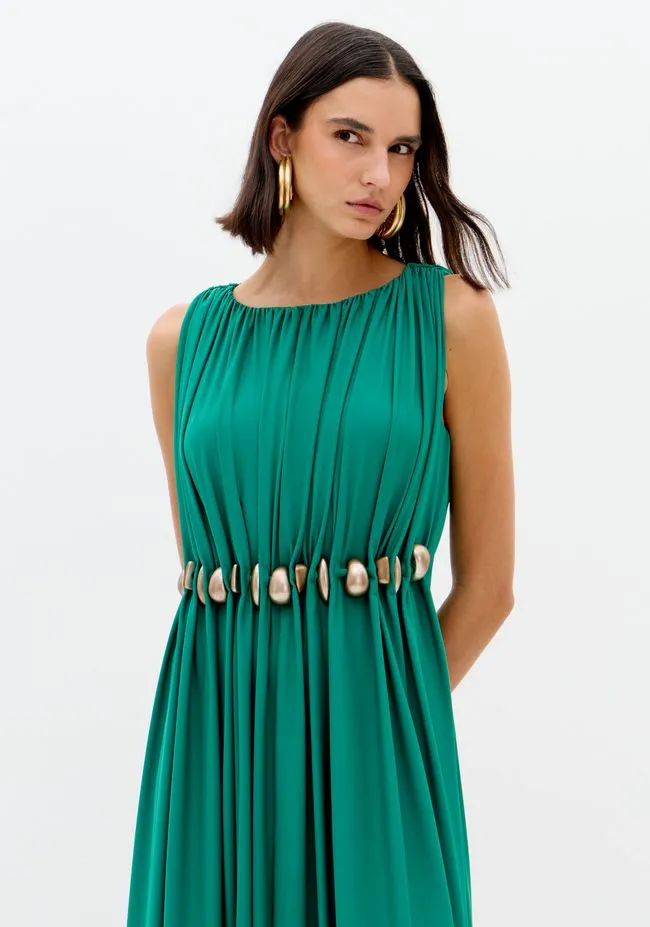 O vestido longo exibe caimento solto, decote redondo e franzidos ao longo de toda a modelagem. O charme fica por conta do cordão embutido com aviamentos e amarração posterior que se entrelaça à malha e valoriza a silhueta com sofisticação. Icônico!