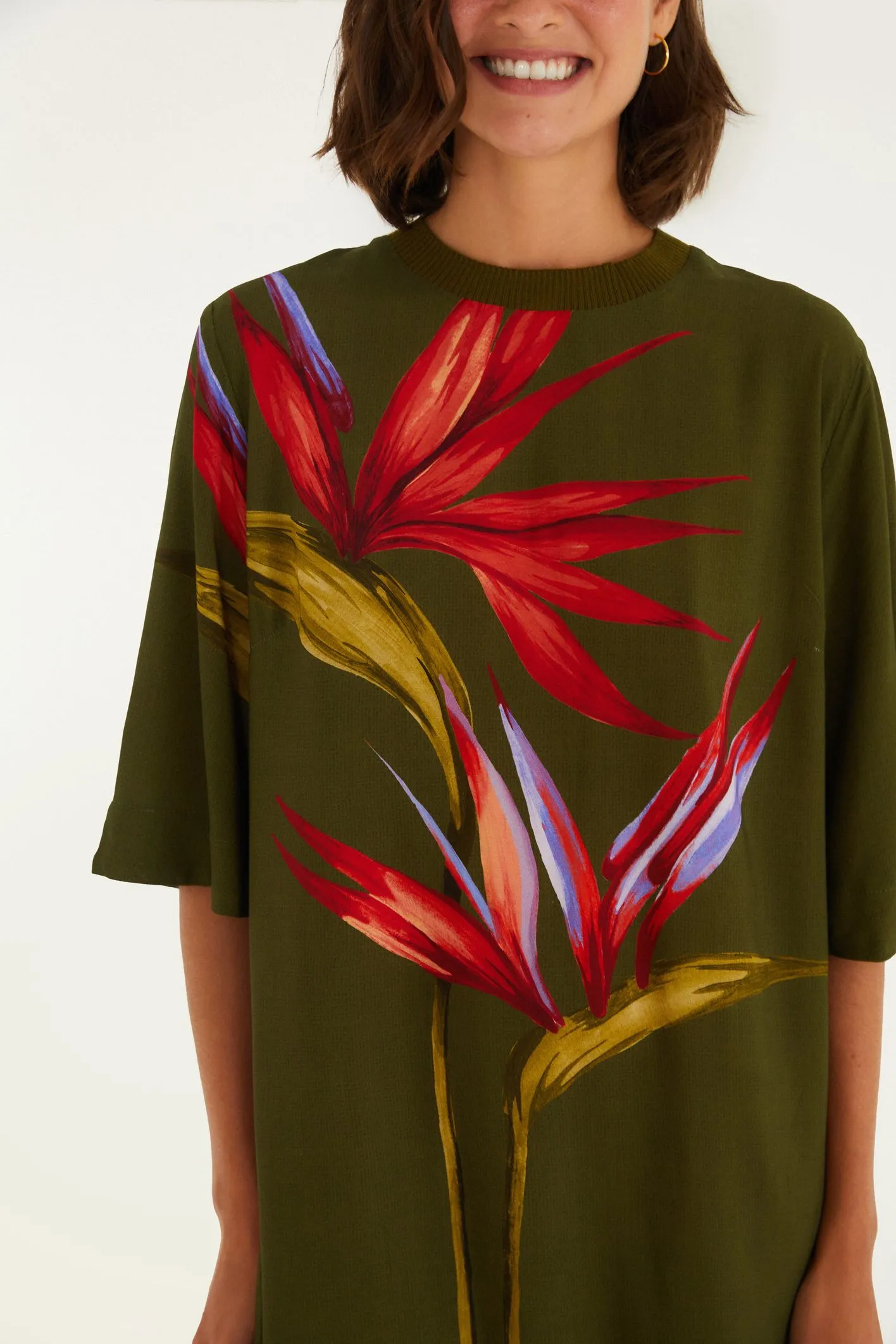 Vestido T-Shirt Estampado Maxi Estrelícia modelagem solta e confortável, ideal para dias casuais. Gola careca e mangas amplas conferem um toque descontraído.